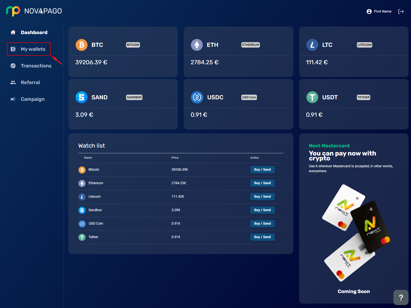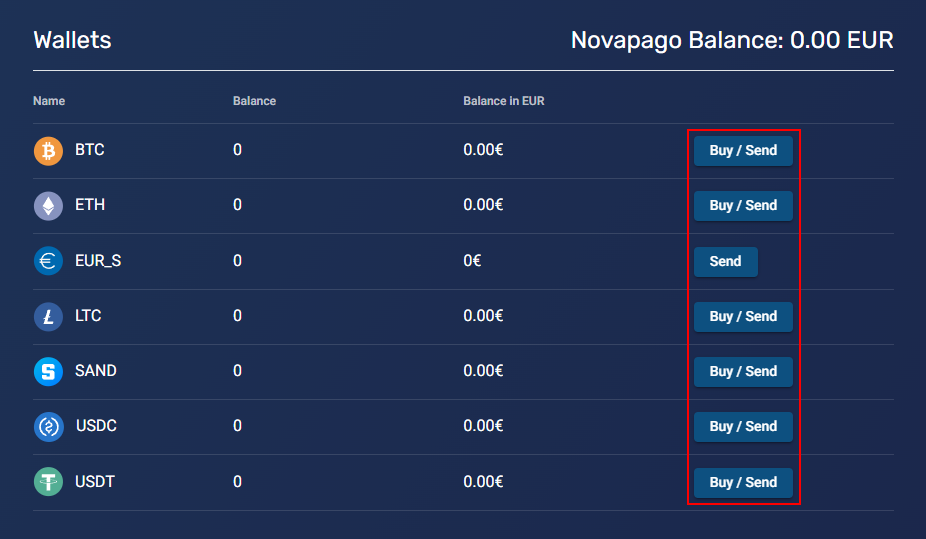 At the bottom of the page, you have a list of your wallets. After each cryptocurrency, there is an option to "Buy/Send"