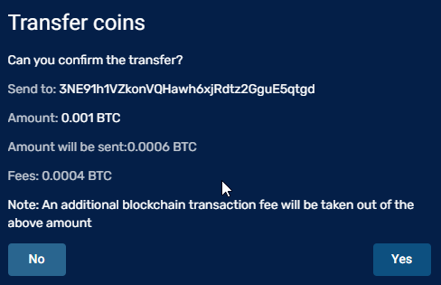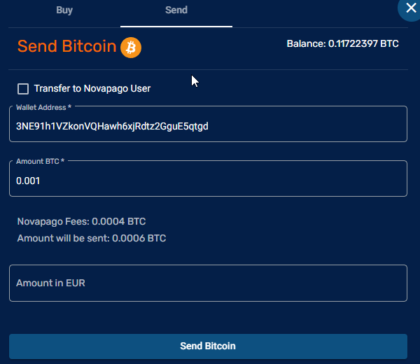 Also, enter the amount you wish to send. You can enter the amount in either the value of the selected cryptocurrency or the value in EUR and it will be calculated automatically. Once the amount is entered the fee will be displayed as well as the amount that will be sent to the receiving wallet after the fees have been deducted.